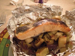 Thirty minutes later in the dining room I had to grab the camera as dinner was being served. This supposed “très simple” dinner our friends had thrown together was salmon on a bed of roasted leeks and red onions with a side of truffle mashed potatoes. I heard some part of my body scream “Vive la France!” — it was either my soul or just my stomach but it didn’t really matter. And it was all going down beautifully with that white wine that certainly was much more than just champagne without bubbles (I really should go back and delete that).