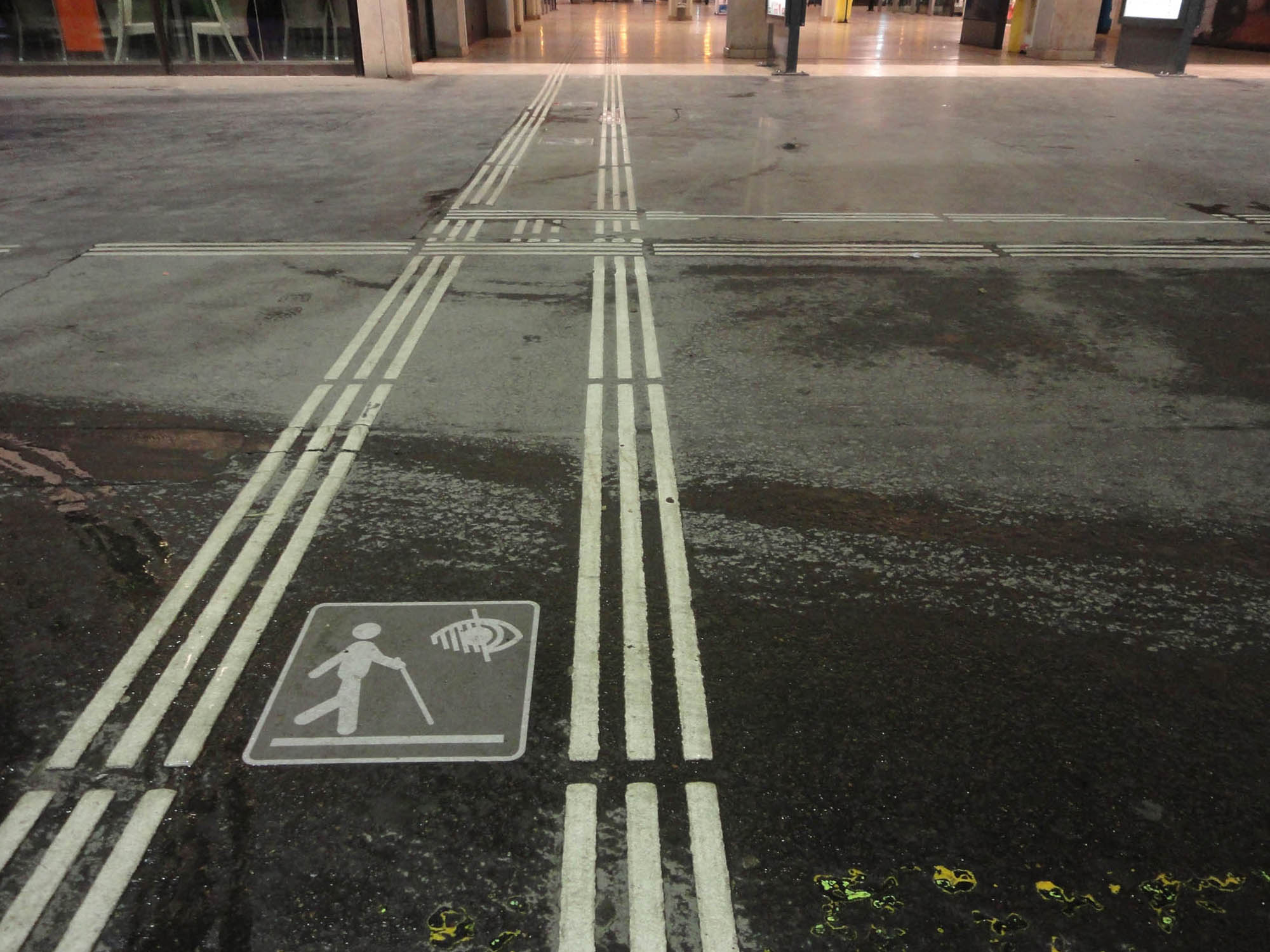 Noticed this on the floor while sprinting through Gare de l’Est to catch a train. After sitting on said train for five minutes realizing its departure wasn’t for another ten, I came back to snap a picture. I’ve never seen such a simple, brilliant, and thoughtful consideration for a blind person trying to navigate a busy public space. Why don’t we put these everywhere?