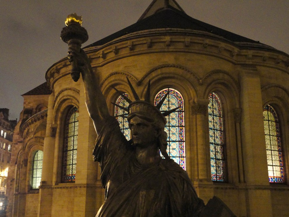 I knew there were a couple of replicas in the city somewhere but this one came completely out of the blue during a quiet stroll. Being set against a medieval Paris church gave it a certain symbolic resonance for this ex-New Yorker, and in a way sums up in one picture the last decade of my life.