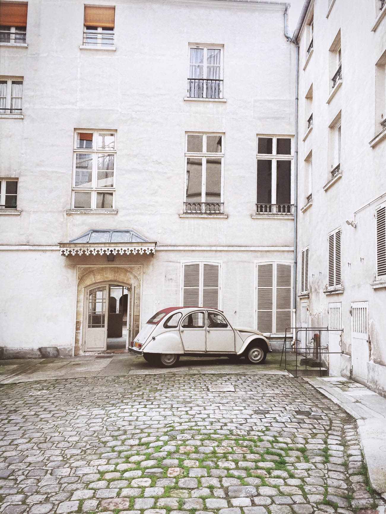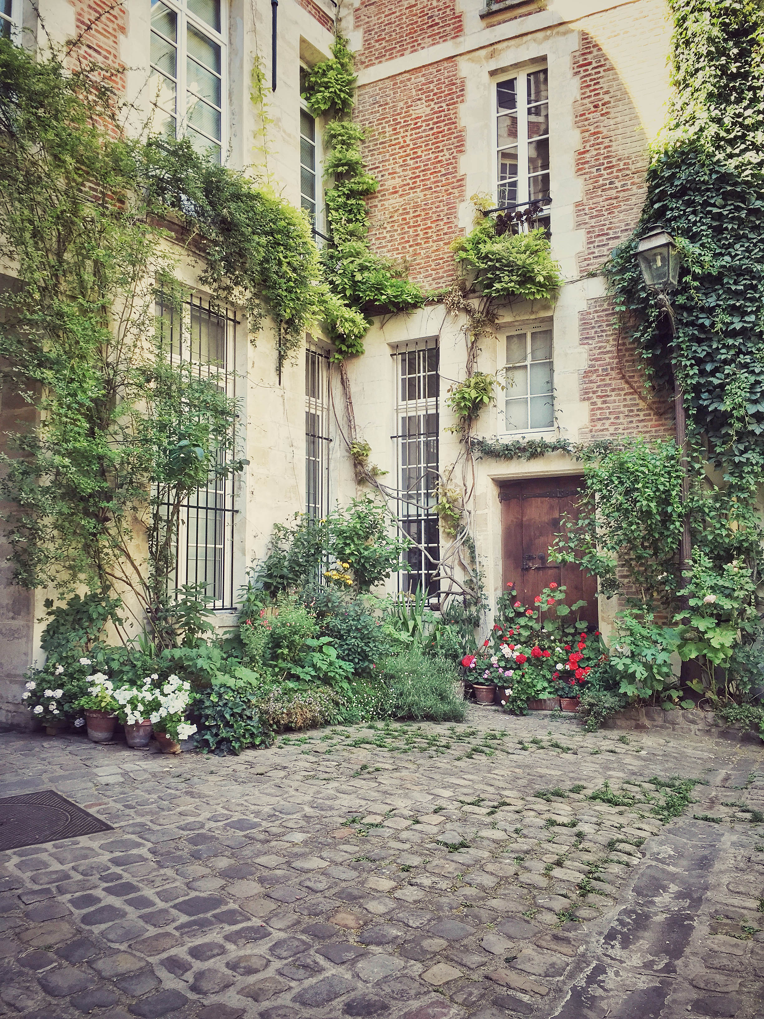 Perhaps it’s because touristy Paris is the feature film and the courtyards are the behind-the-scenes clips, reserved only for the initiated and extra-curious. Sometimes it’s as if you’ve caught Paris unawares in her boudoir, after the evening gown and jewelry have come off, and somehow she looks just as good–or even better–behind closed doors.