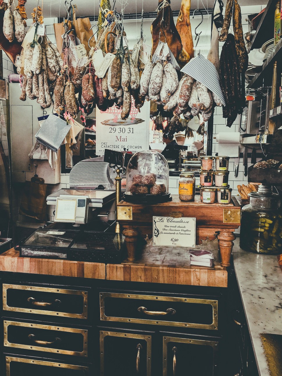 This shop, Caractère de Cochon (3rd arr), is actually quite recent. But the owners have done such a brilliant job of recreating an antique atmosphere. Any place that hangs cured meats like Christmas garland has me at hello.
