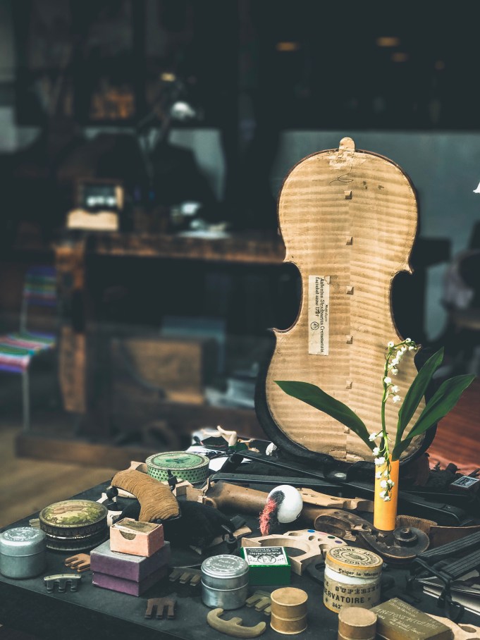 As a cello (and violin) player I share your enthusiasm for the Atélier Luthier – When I was often in Bern Switzerland, I talked for hours to one of the best known instrument builders and he gave me much helpful advice (but he didn’t want to buy my violin…. lol). These places are MAGIC but I know from several of my ‘connaissances’ that it is a métier those artisans struggle to keep afloat – Chinese instruments of pretty good quality swarm the world and you can’t honestly blame a buyer for wanting to give his child or himself an affordable instrument. But it is a rather sad story. This shot of yours is full of nostalgic love and pride, and the dust & muguet add just the little touch of what I like.